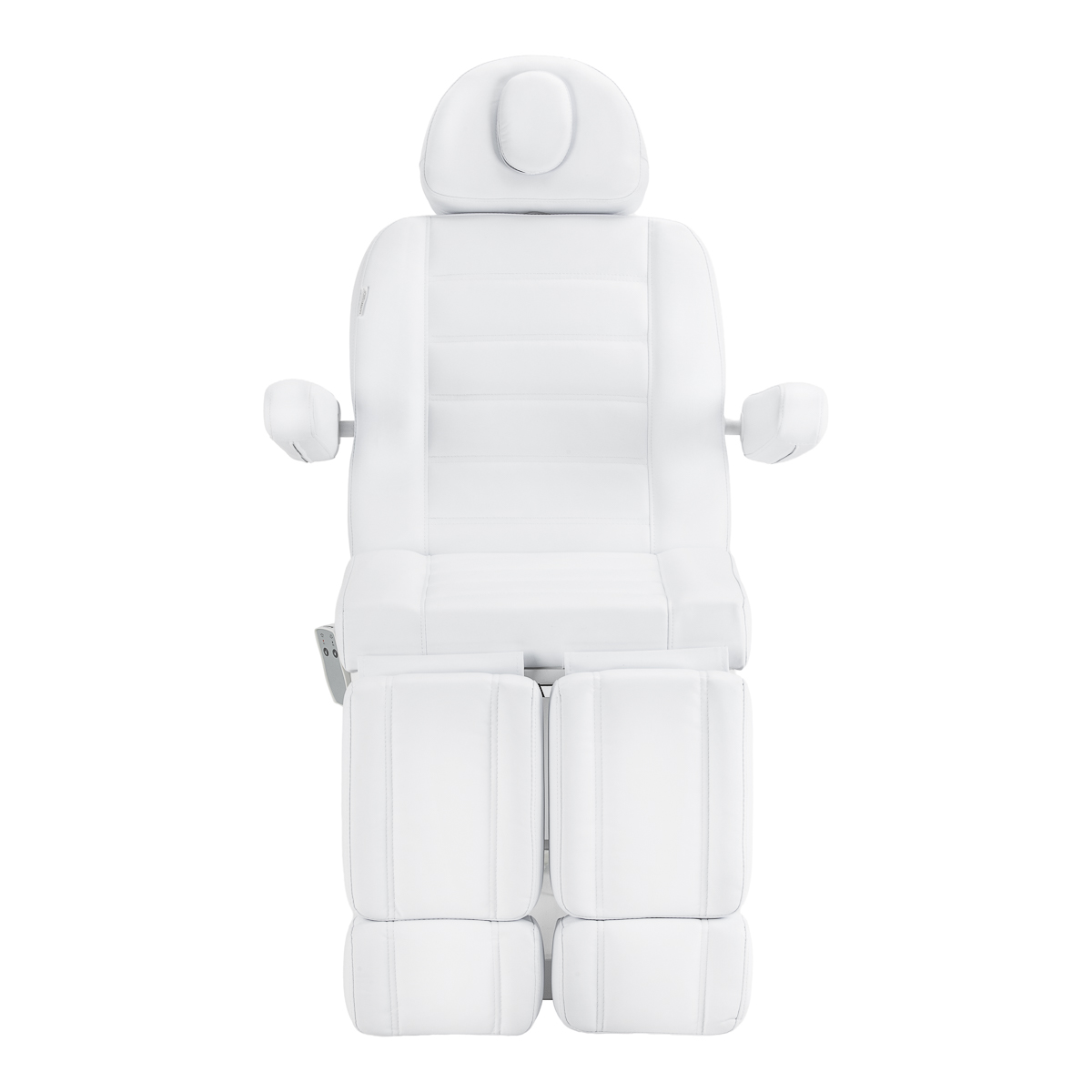 Die breite Sitzfläche sorgt für hohen Komfort auch bei längeren Behandlungen. Die beweglichen, hochklappbaren Armlehnen erleichtern dem Kunden das Platznehmen auf dem Liege und gewährleisten dem Behandler freien Zugang. Der Stuhle ist mit einer um 20 Zentimeter ausziehbaren Kopfstütze ausgestattet, die eine stabile Stütze für den Kopf und zusätzlichen Komfort bietet, insbesondere für größere Benutzer. Eine unter einer Abdeckung verborgene Öffnung in der Kopfstütze erhöht den Komfort in liegender Position, insbesondere bei Behandlungen am Rücken. Durchdachte Konstruktionslösungen sorgen für den Komfort des Kunden und die Ergonomie der Arbeit des Spezialisten.