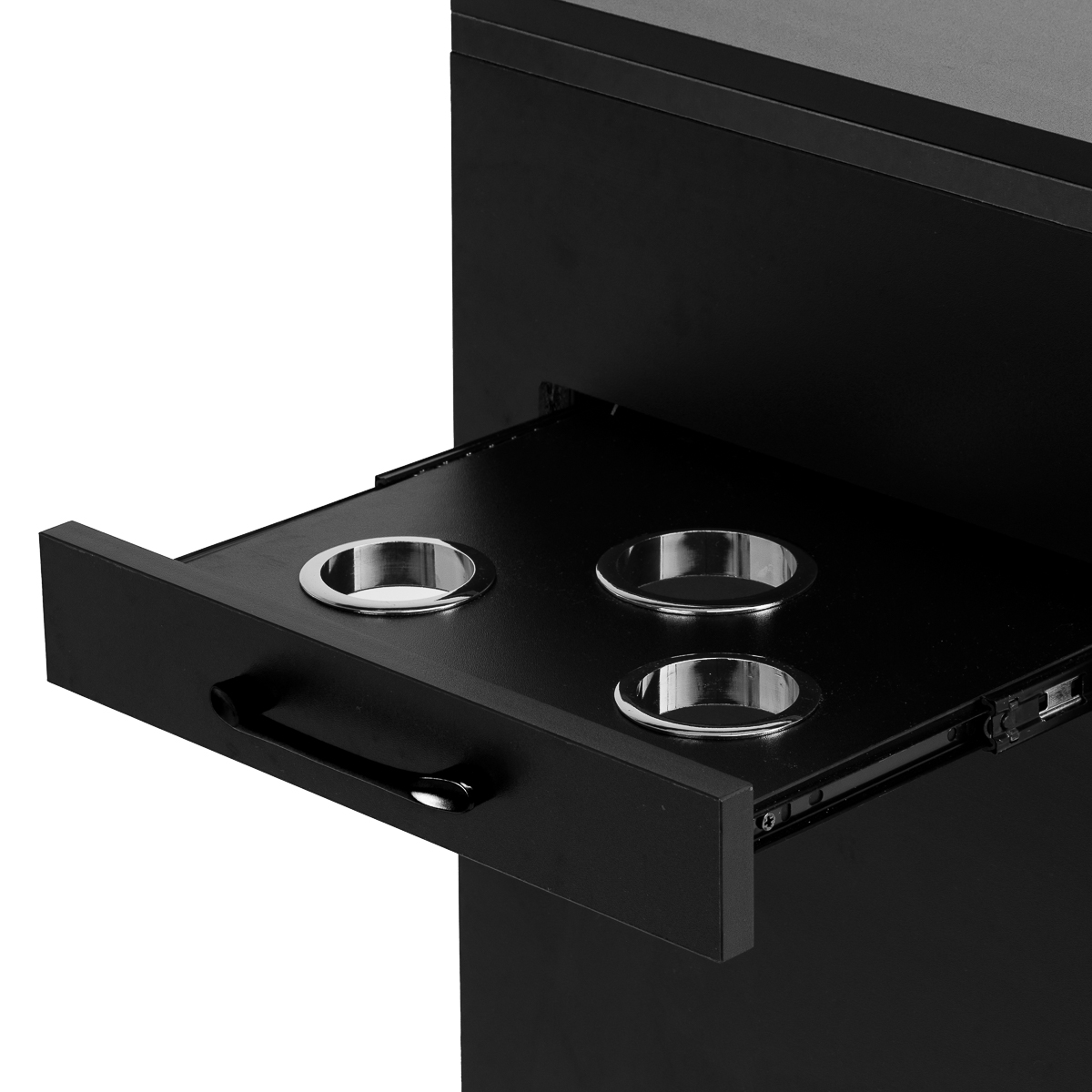 Der Assistent hat eine zusätzliche seitliche, ausziehbare Schublade mit Metallhaltern für Werkzeuge. Drei Öffnungen bieten einen stabilen Platz für Föhne, Lockenstäbe, Glätteisen oder Bürsten und ermöglichen ein bequemes Ablegen während des Stylings. Diese Lösung sorgt für einen freien Zugriff auf die wichtigsten Geräte, ohne sie auf der Arbeitsfläche ablegen zu müssen.