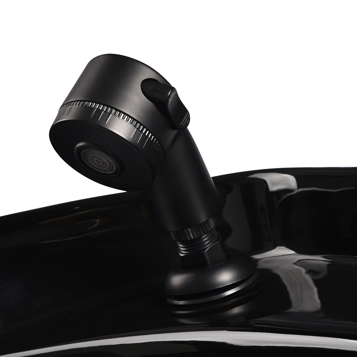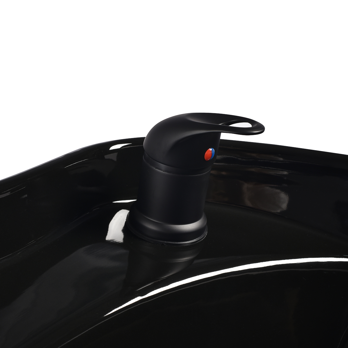 Die entsprechende Tiefe der Waschtischschale aus weißer Keramik verhindert übermäßiges Spritzen von Wasser oder Produkten, die während der Behandlung verwendet werden. So kann eine Vielzahl von Dienstleistungen komfortabel und effizient durchgeführt werden. Der Neigungswinkel der Schale lässt sich verstellen, so dass sie leicht an die individuellen Bedürfnisse angepasst werden kann. Die hohe Qualität der verwendeten Materialien macht das Waschbecken langlebig, resistent gegen Verfärbungen und Kratzer und sehr leicht zu reinigen. Ein richtig profilierter Kragen und eine geneigte Rückenlehne bieten Halt und Komfort beim Haarewaschen, und dank der bequemen Kunststoffauflage in Schwarztönen wird der Kunde keine Unannehmlichkeiten im Zusammenhang mit der Kälte der Keramikoberfläche empfinden.