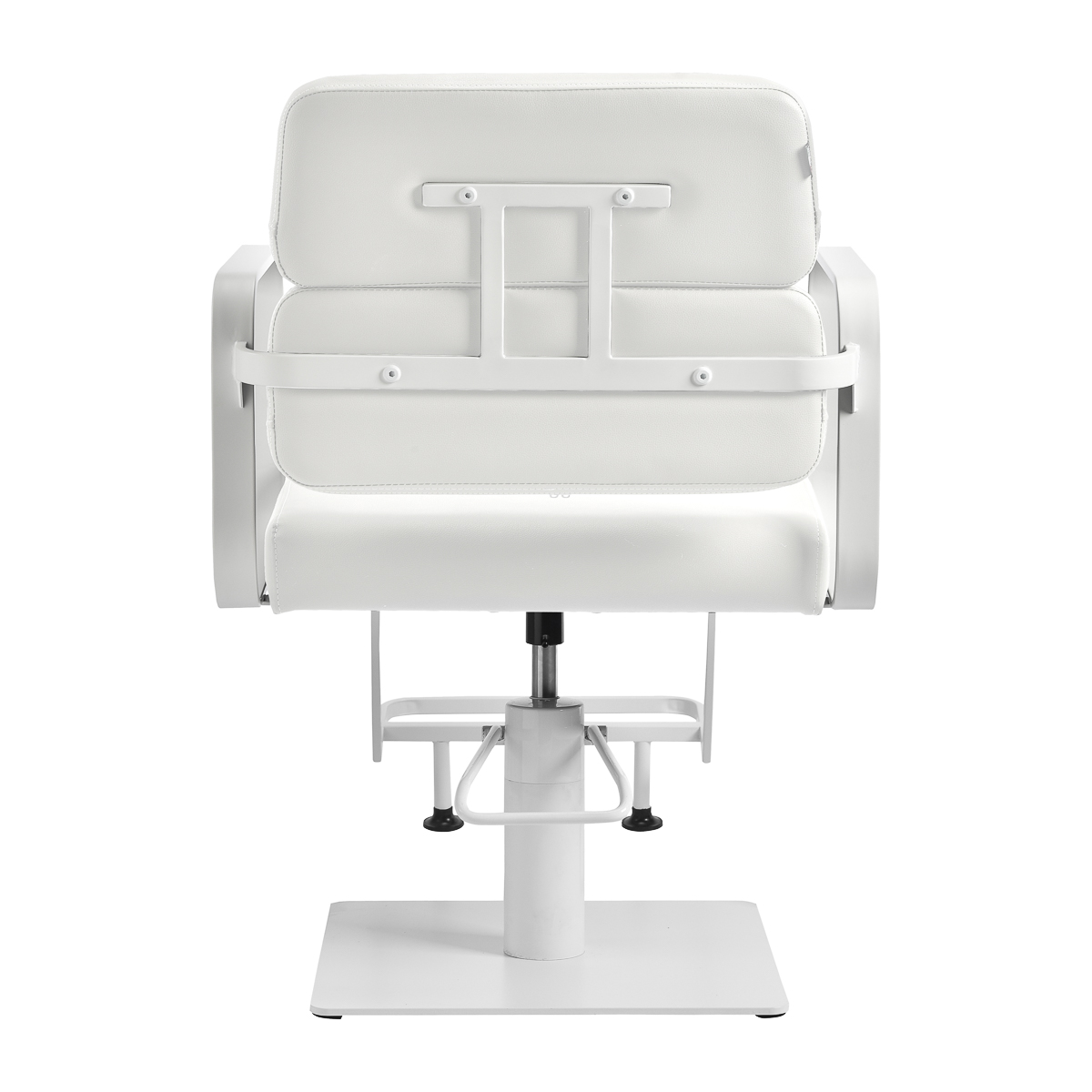 Die Füllung aus strapazierfähigem, verformungsbeständigem Schaumstoff und die Polsterung aus angenehm haptischem Kunstleder sorgen für die Langlebigkeit der Möbel und ihre komfortable Nutzung über einen langen Zeitraum. Außerdem machen sie die Geräte feuchtigkeitsbeständig, langlebig und leicht zu reinigen. Der Bezug in Weißtönen verleiht ihm einen einzigartigen Charakter. Die Ausstattung zeichnet sich durch ein modernes Design aus, das den Sessel in vielen professionellen Salons großartig aussehen lässt.
