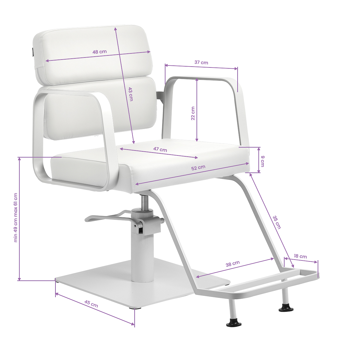 Mit einem langlebigen hydraulischen Lift können Sie das Sitzniveau zwischen 49 und 61 cm verstellen – auch wenn der Kunde auf dem Stuhl sitzt. Es bietet ein ergonomischeres Arbeitserlebnis, da die Sitzhöhe an die Körpergröße des Kunden und des Friseurs angepasst werden kann. Die optisch ansprechende Rückenlehne ermöglicht es Ihnen, eine bequeme Position einzunehmen, die eine hervorragende Rückenstütze bietet, was besonders bei vielen Behandlungsstunden wichtig ist. Ein großes Plus dieses Modells ist das Loch, das zwischen der Rückenlehne und dem Sitz bleibt. Es macht es einfacher, den Salon sauber zu halten, so dass Sie Ihre Haare leicht aus allen Ecken und Winkeln des Stuhls fegen können. Auf diese Weise können Sie die Vorbereitung des Arbeitsplatzes zwischen den Kunden optimieren.