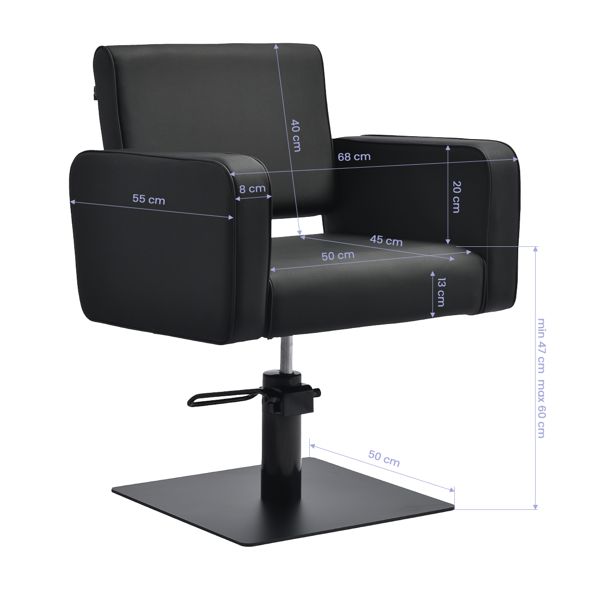 Der langlebige hydraulische Lift ermöglicht eine stufenlose Verstellung der Sitzhöhe von 47 bis 60 cm – auch wenn der Kunde auf dem Sitz sitzt. Dadurch wird die Arbeit ergonomischer und die Position kann leicht an die Körpergröße des Kunden und des Friseurs angepasst werden. Die bequeme Rückenlehne bietet eine stabile Rückenstütze und erleichtert das Einnehmen einer bequemen Position, was besonders bei langen Behandlungen wichtig ist, um den Komfort und die Kundenzufriedenheit zu erhöhen.