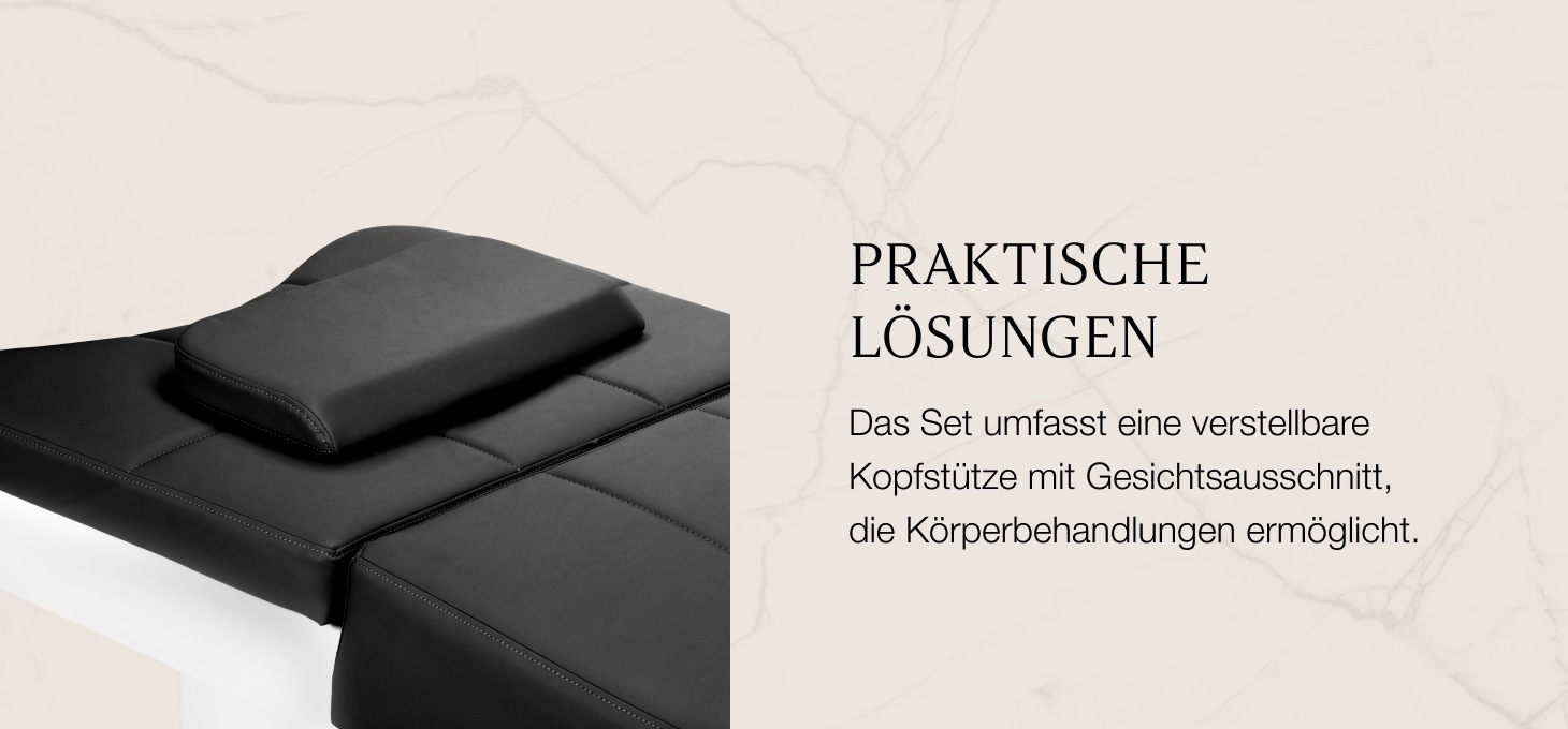 Die verstellbare Kopfstütze mit der Möglichkeit, den Neigungswinkel zu verlängern und zu ändern, sorgt für eine perfekte Anpassung an die Bedürfnisse des Benutzers und erhöht den Komfort während der Behandlungen. Das Set enthält auch ergonomische Kissen, darunter eine Kopfstütze mit Gesichtsöffnung, mit der Sie nicht nur Kopfhautpflege, sondern auch Massagen und eine Vielzahl von Körper- und Gesichtsbehandlungen durchführen können. Dank dieser praktischen Lösungen wird die Liege zu einem vielseitigen Element der Ausstattung von Schönheits- und Wellnesssalons, das Komfort und Wirksamkeit jeder Therapie garantiert.