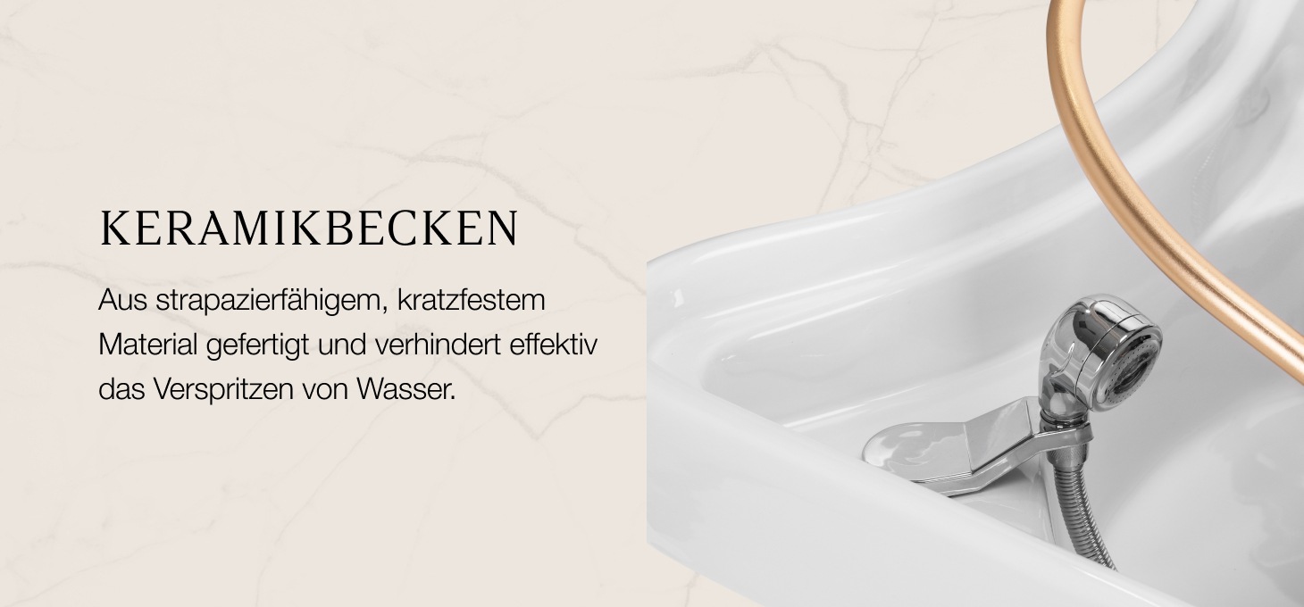 Eine tiefe Keramikschale in Weißtönen verhindert effektiv das Spritzen von Wasser und Produkten, die während der Behandlungen verwendet werden, und sorgt so für Sauberkeit und Komfort bei der Arbeit. Seine einzigartige Biegung erleichtert nicht nur den Zugang für die Person, die die Dienstleistung ausführt, sondern verleiht der Waschanlage auch einen eleganten, modernen Charakter. Die aus strapazierfähigem Material gefertigte Schüssel ist resistent gegen Verfärbungen, Kratzer und Beschädigungen und lässt sich durch ihre glatte Oberfläche extrem leicht sauber halten. Die Kombination aus Funktionalität und Ästhetik hebt den Standard eines jeden professionellen Raums.