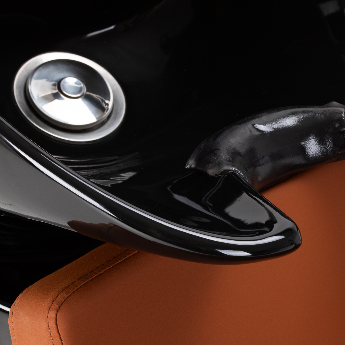 Die tiefe keramische Waschschüssel in Schwarztönen minimiert das Spritzen von Wasser und Kosmetika. Der verstellbare Neigungswinkel ermöglicht eine präzise Anpassung an die Bedürfnisse des Kunden. Das langlebige Material ist beständig gegen Verfärbungen, Kratzer und Chemikalien, während die glatte Oberfläche die Reinigung erleichtert. Der ergonomisch geformte Nackenbereich bietet bequemen Halt, und die schwarze Kunststoffauflage verhindert das Kältegefühl beim Kontakt mit der Keramik.