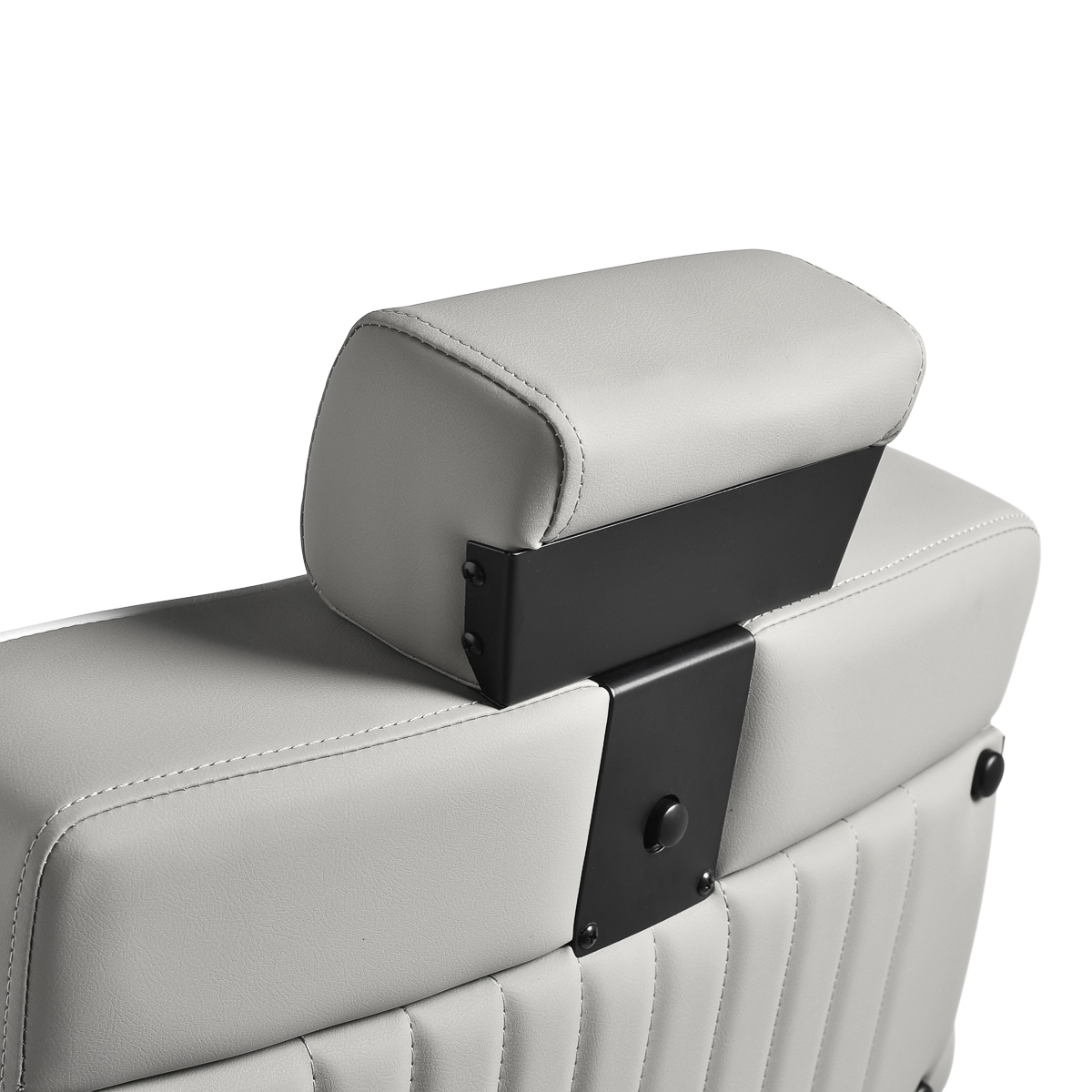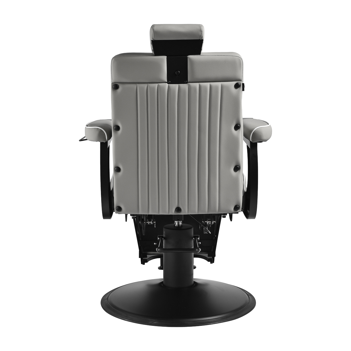 Der schwarze, runde Boden sorgt für Stabilität und Langlebigkeit. Die Polsterung besteht aus weichem, mattem Kunstleder, das Komfort mit Langlebigkeit verbindet. Die verwendeten Materialien sind feuchtigkeitsbeständig, langlebig und leicht zu reinigen. Stilvolle Nähte und Polsterungen in Grautönen verleihen ihm einen einzigartigen Charakter, der perfekt zum Dekor moderner Friseursalons passt. Die Kombination des eleganten Farbtons der Polsterung mit dem schwarzen Gestell und Untergestell unterstreicht den modernen, professionellen Look des Sessels.
