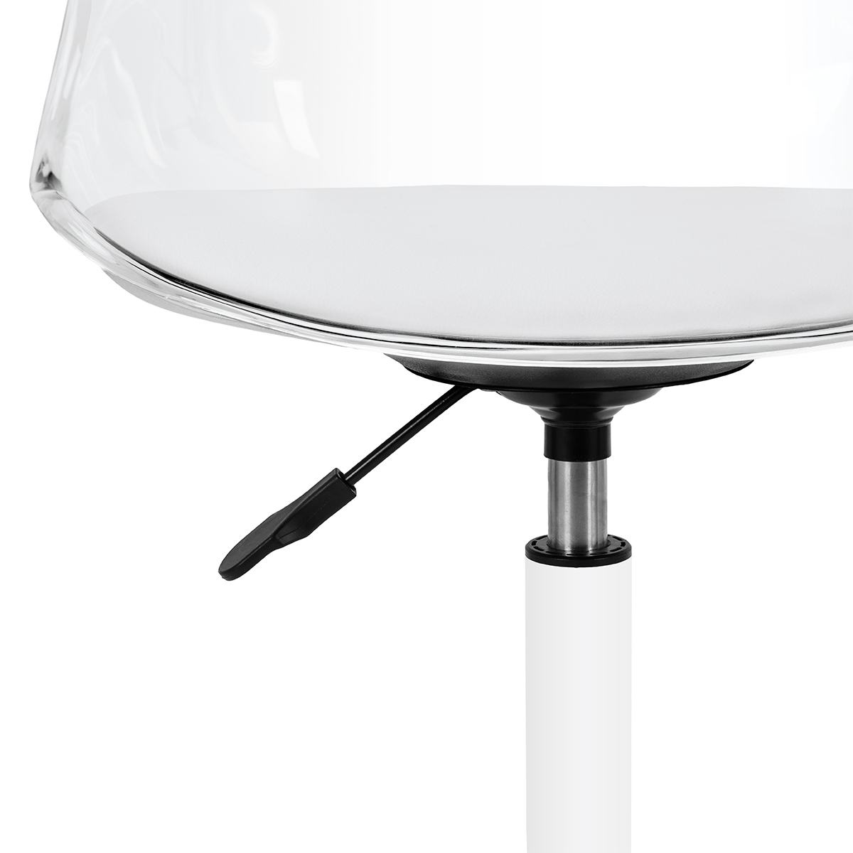 Das Modell zieht mit seiner beeindruckenden, transparenten Rückenlehne Aufmerksamkeit auf sich, was dem Ganzen Leichtigkeit und einen modernen Charakter verleiht. Die Kombination aus transparentem Design mit gepolstertem weißem Leder, einem synthetischen Sitzkissen und einer weißen Basis schafft einen anspruchsvollen Kontrast, der Eleganz betont. Dank dessen wird der Stuhl nicht nur zu einem funktionalen Gerät, sondern auch zu einer stilvollen Dekoration des Büros. Es passt perfekt in jedes Interieur und passt perfekt zur Ästhetik moderner Schönheitssalons.