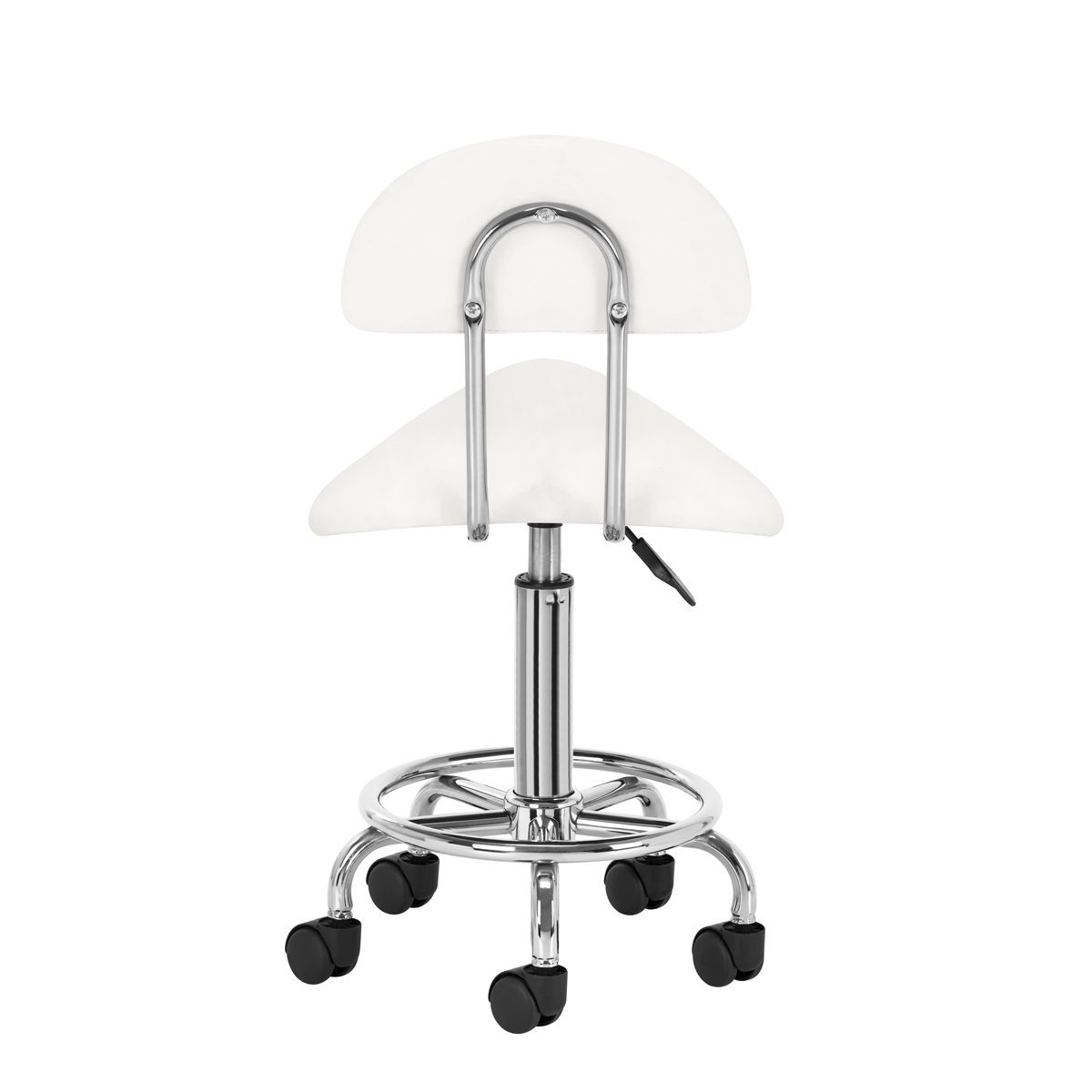 Ein bequemer, stabiler Kosmetikhocker mit einer Rückenlehne und einem gut geformten Sitz verfügt über ein 5-armiges Gestell und Kunststoffräder. Er ist in Weiß erhältlich. Er ist ein unentbehrliches Möbelstuck im Schönheitssalon.