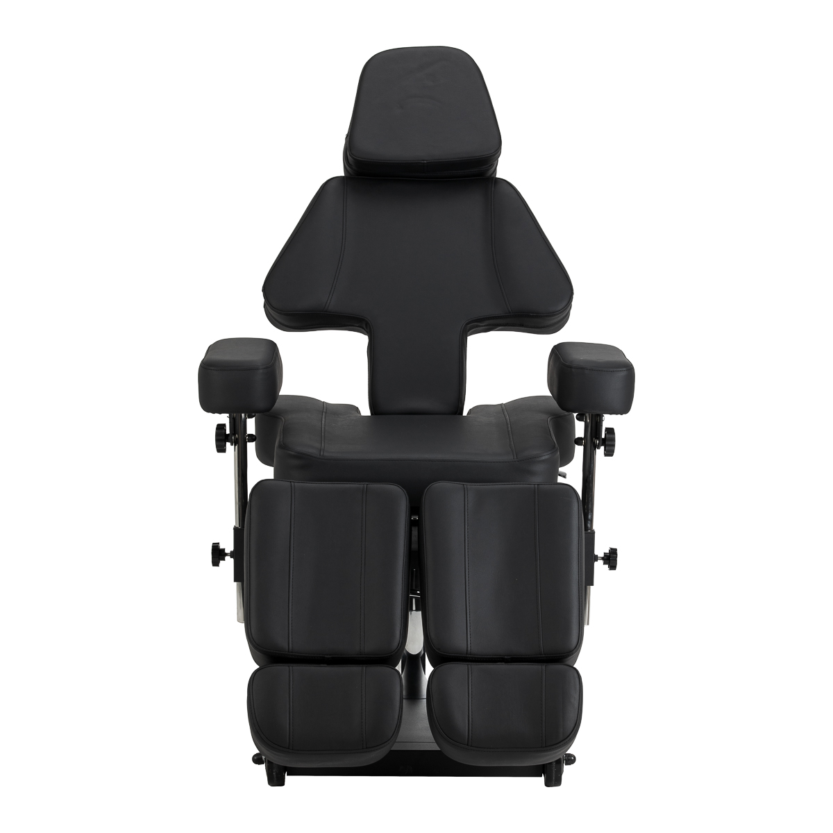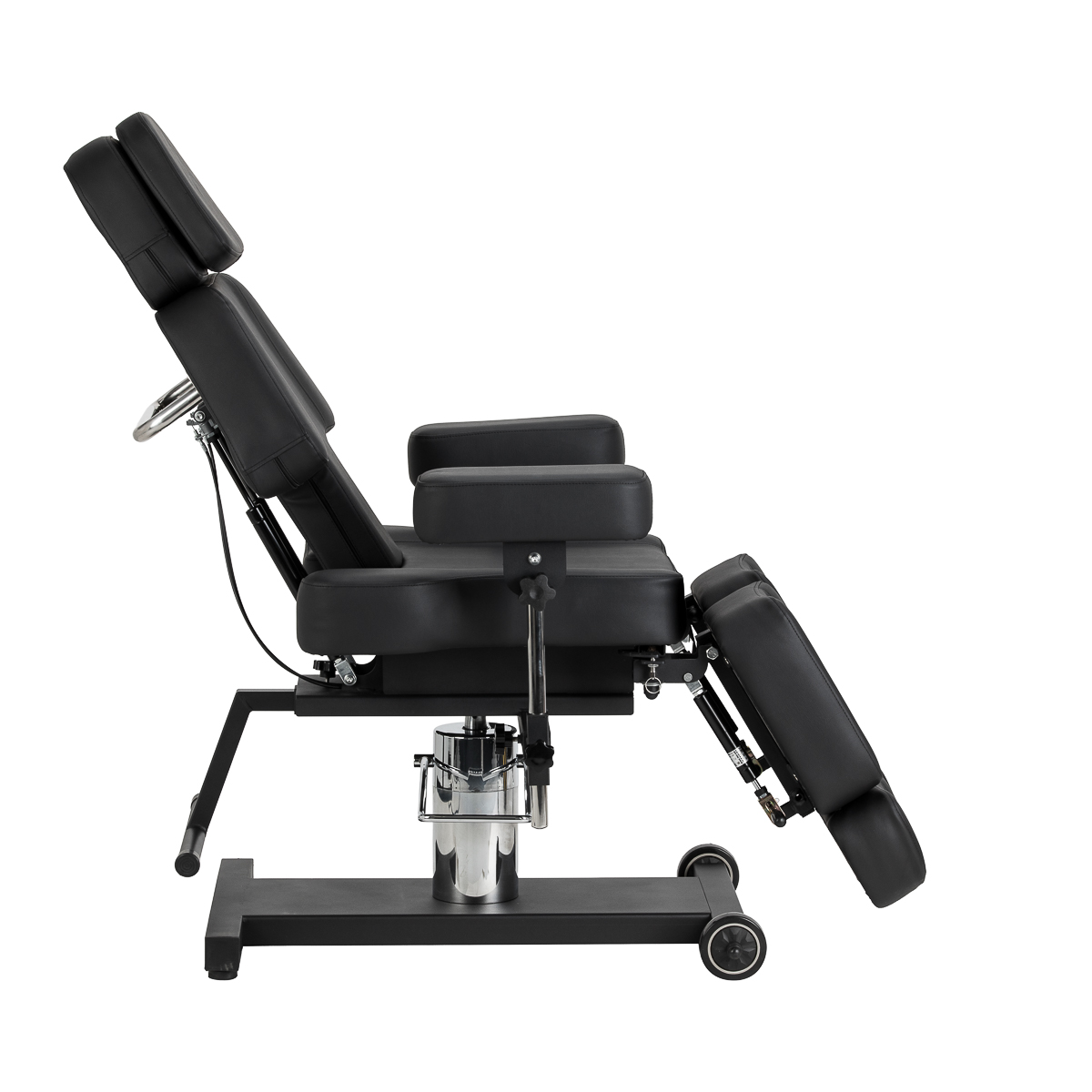 Die Sitzhöhe lässt sich mithilfe des hydraulischen Zylinders im Bereich von 60–78 cm verstellen, während der Stuhl im vollständig ausgeklappten Zustand eine Länge von bis zu 200 cm erreicht. Die manuelle Einstellung des Neigungswinkels von Rückenlehne und Beinauflagen ermöglicht eine Anpassung an die jeweilige Behandlung. Die geteilte Beinauflage mit unabhängiger Segmentverstellung und seitlicher Einstellung erlaubt eine individuelle Positionierung der Beine und erhöht sowohl den Arbeitskomfort als auch die Bewegungsfreiheit. Die ausziehbare Beinauflage bietet auch größeren Personen eine stabile Unterstützung. Abnehmbare Armlehnen mit Höhen- und Winkelverstellung erweitern die Einstellmöglichkeiten und erleichtern die Anpassung an aktuelle Bedürfnisse. Das Ergebnis ist eine ergonomische und funktionale Lösung, optimal auf die Anforderungen eines professionellen Tattoostudios abgestimmt.