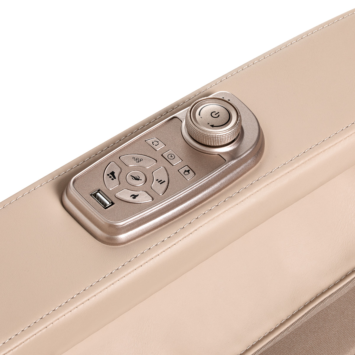 Für noch mehr Bedienkomfort ist der Stuhl mit einer Reihe von Bedienknöpfen ausgestattet, die in die linke Armlehne eingebaut sind. Die handliche Fernbedienung ermöglicht einen schnellen Zugriff auf die wichtigsten Funktionen, ohne nach dem Hauptpanel greifen zu müssen. Mit ihm können Sie ganz einfach den Massagemodus wechseln, eine Fußmassage starten oder die Zero Gravity-Funktion aktivieren – alles für maximalen Komfort und glückselige Entspannung. Darüber hinaus ist es mit einem USB-Anschluss ausgestattet, über den Sie Ihr Telefon während der Massage aufladen können.