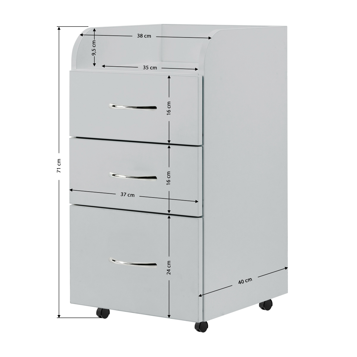 Drei Schubladen in unterschiedlichen Größen ermöglichen eine bequeme Ordnung von Zubehör, Werkzeugen und Kosmetikprodukten. Die Mobilität des Möbelstücks wird durch praktische Rollen gewährleistet, darunter zwei mit Feststellern, die das Umstellen des Schranks erleichtern und eine stabile Aufstellung an der gewünschten Stelle ermöglichen. Das speziell für Podologiepraxen entwickelte Design umfasst einen eigenen Platz für eine Podologiefräse mit Absaugvorrichtung, was eine ergonomische Arbeitsplatzgestaltung fördert und den Komfort bei der Durchführung von Behandlungen erhöht.